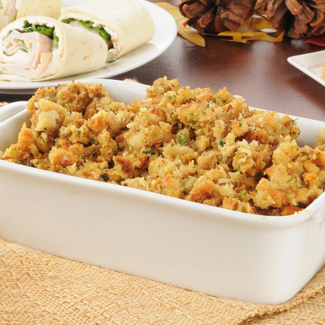 Our traditional stuffing is made of bread crumbs, onions and celery flakes. Heat and serve.